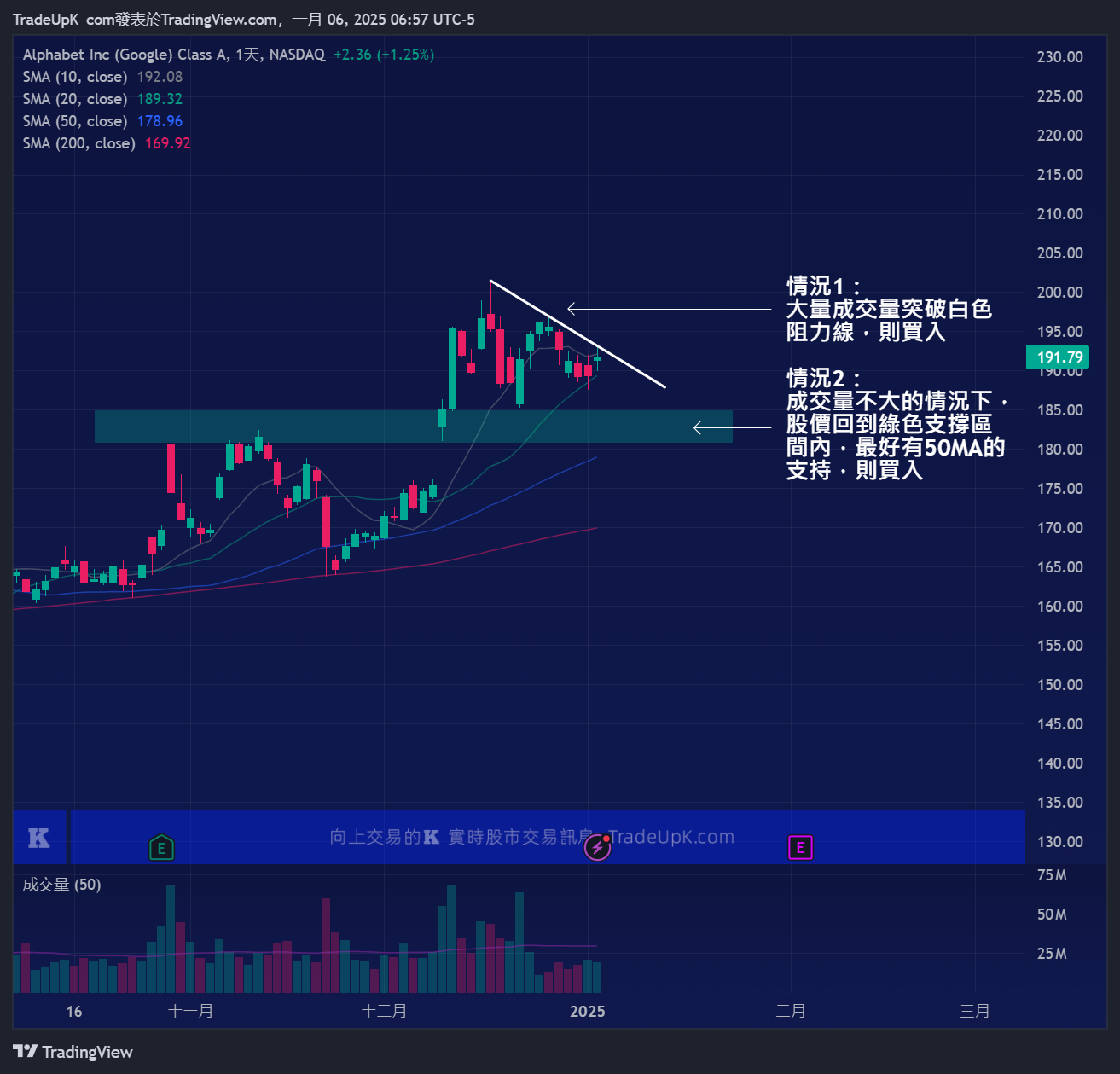 這輪震蕩,納指跌破50MA,標普也跌破50MA,但谷歌只是輕輕碰了下20MA就上升回去了,可見谷歌在這波震蕩中是看多方大於看空方的,相對強度不錯,具體買入時機參考看截圖。
