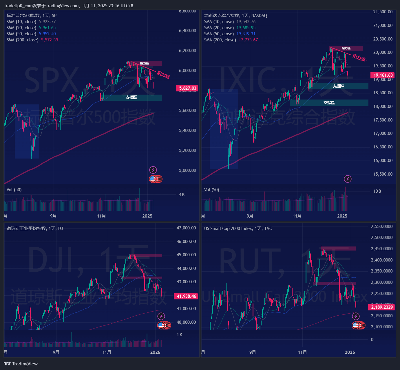 先總結本週的走勢與我在上週 1月4日 發布的大盤分析結果一致:大盤繼續震盪,並且存在震盪走低的可能性。整理的時間尚不足,我也提到過不會去搶這種反彈,風險過高。結果完全應驗,現在顯然已經是一輪中期調整,四大指數均已跌至 50MA 以下,這正是當前市場大多數投資者選擇的體現。