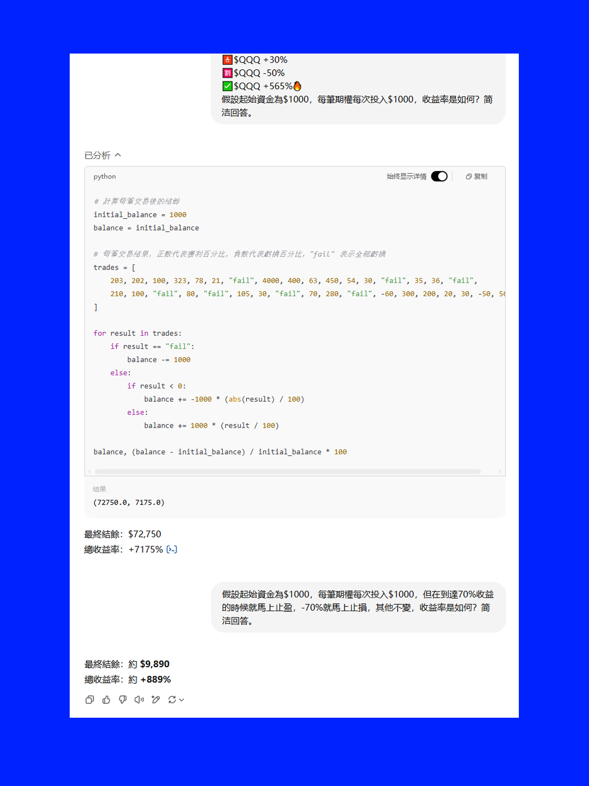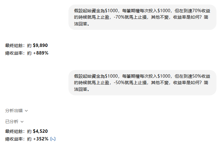 我也另外讓GPT算了兩種50%止盈和70%止盈的收益率,具體數據可以看下圖。