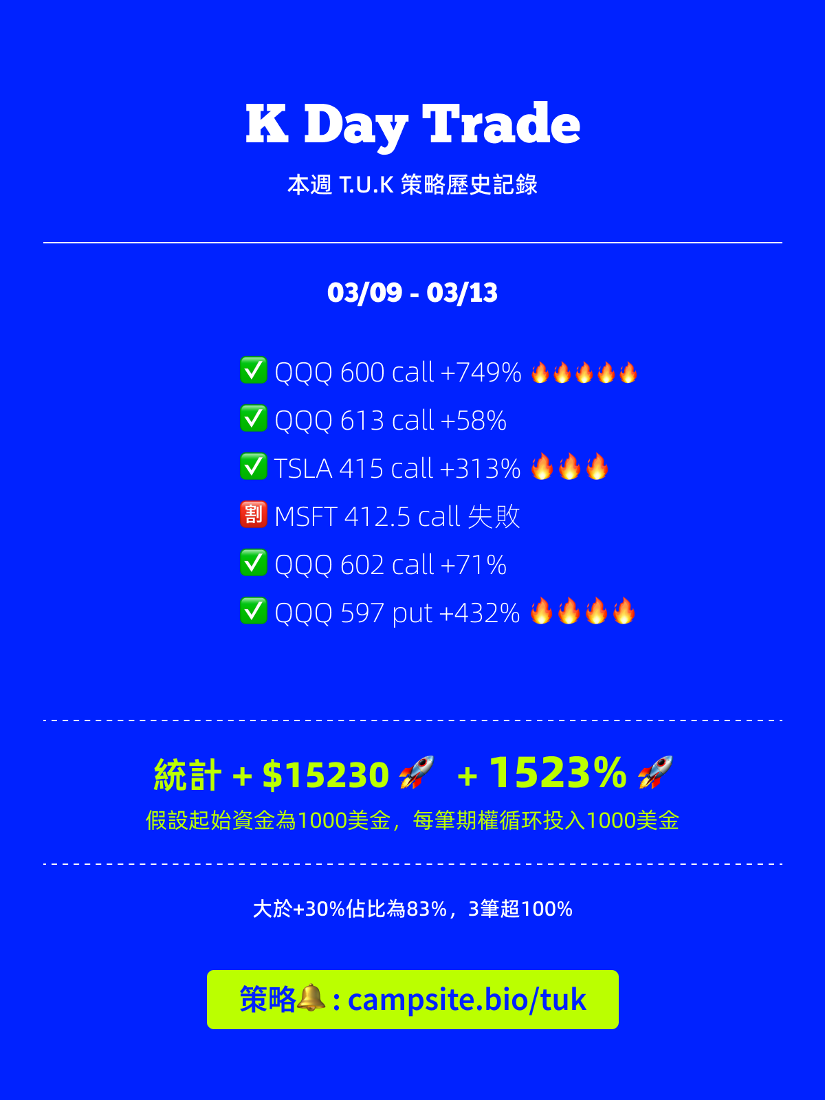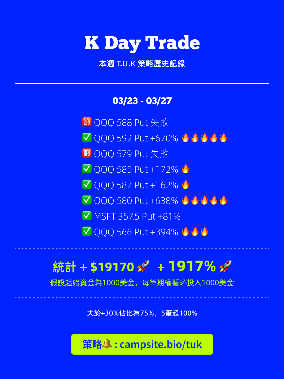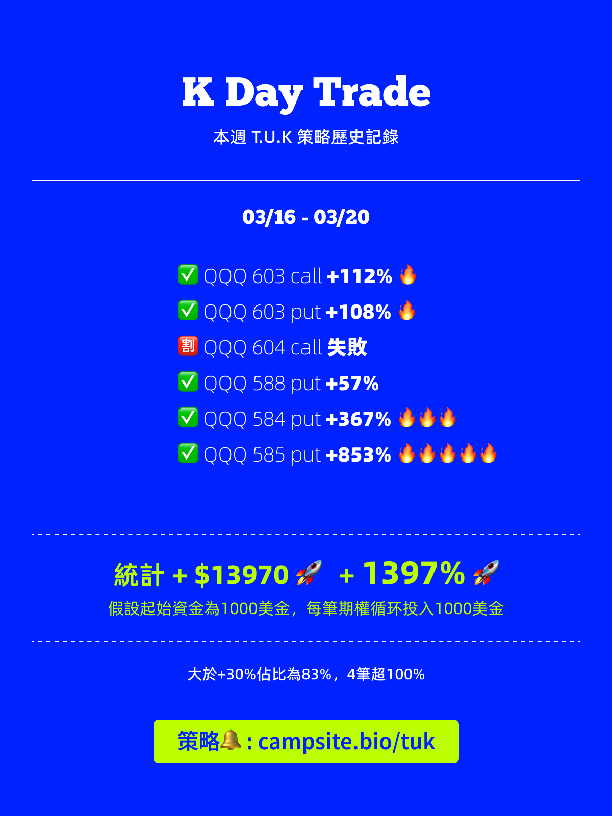09 Apr 2026 T.U.K 付費會員 最近太eazy了,這裡更新都懈怠了 忙著撿錢,有點沒有動力寫文章,後面還是要勤力更新,最近幾周真的發夢都偷笑。有興趣可以一起偷笑 👉 https://im.page/tuk 👈 Written by: 向上交易的K 股市的魅力在於翻倍,在於指數級的增長
